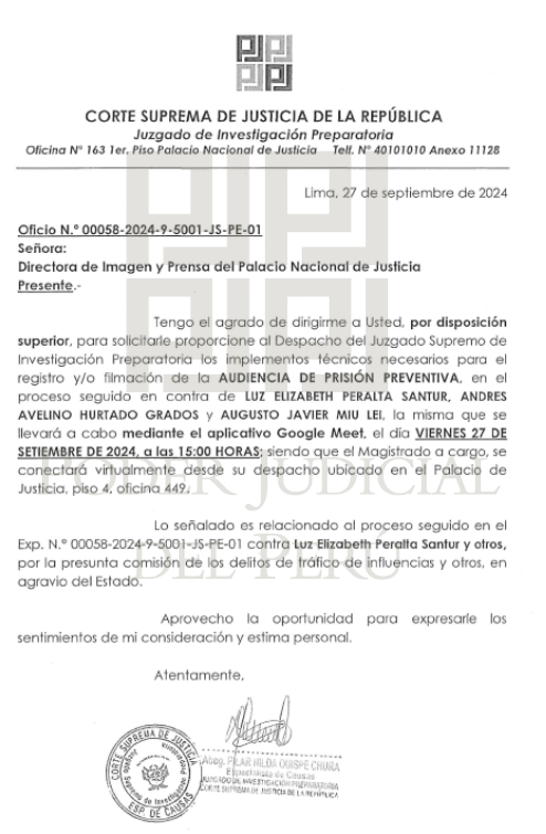 El Poder Judicial ha confirmado que la audiencia de prisión preventiva contra Andrés Hurtado 'Chibolín', Javier Miu Lei, y la fiscal Elizabeth Peralta se llevará a cabo hoy, viernes 27 de septiembre, a las 3:00 p.m. Esta audiencia responde a las investigaciones que involucran a los tres en presuntos delitos relacionados con corrupción y lavado de activos.