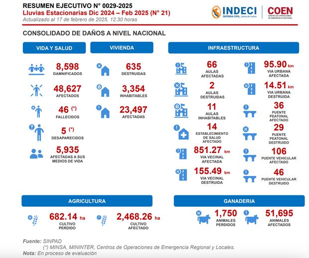 En poco más de una semana, los huaicos, derrumbes, inundaciones y otras emergencias causadas por lluvias intensas se duplicaron en el país. De 1.771 eventos registrados desde diciembre del 2024 al 17 de febrero, pasaron a 3.136 hasta ayer, según el último reporte del Centro de Operaciones de Emergencia Nacional (COEN). En esos diez días, 16 personas fallecieron y otras cuatro se encuentran desaparecidas. La cifra total de víctimas asciende a 62 muertos y 9 desaparecidos en tres meses.