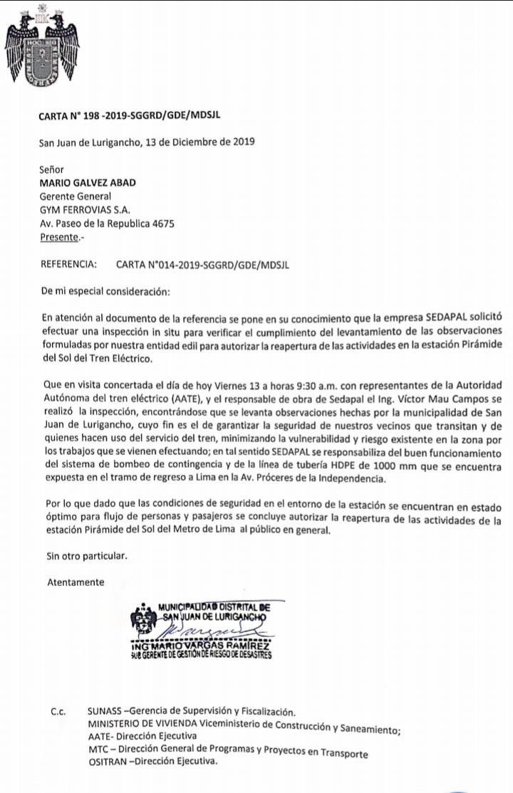 “El viernes 13 a las 9:30 p.m., representantes de la Autoridad Autónoma del Tren Eléctrico (AATE) y el responsable de obra de Sedapal, el Ing. Víctor Mau Campos, realizaron la inspección, encontrándose que se levanta las observaciones hechas por la municipalidad”, se lee en la misiva emitida por el Ing. Mario Vargas Ramírez, sub. Gerente de Gestión de Riesgo de Desastres de la Municipalidad de San Juan de Lurigancho.