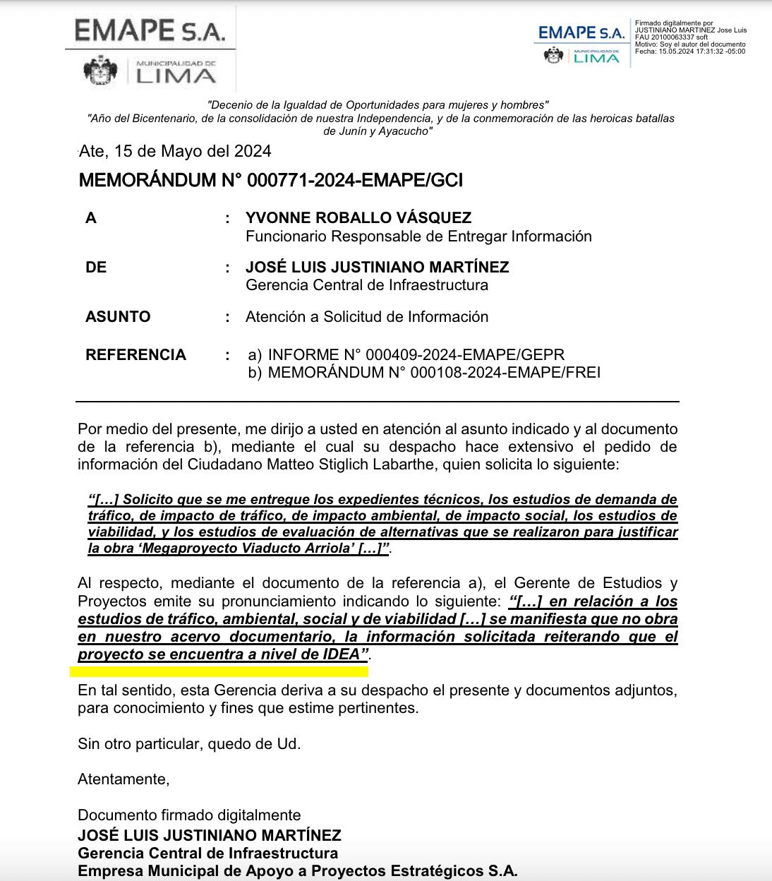 Solicité por transparencia expedientes técnicos, estudios, y evaluación de alternativas para una de las obras más publicitadas por la MML: el viaducto Arriola. La respuesta: no existen porque "el proyecto se encuentra a nivel de idea". Así de improvisados son. https://t.co/fQQQFMTkRG pic.twitter.com/EtvbmZVinf