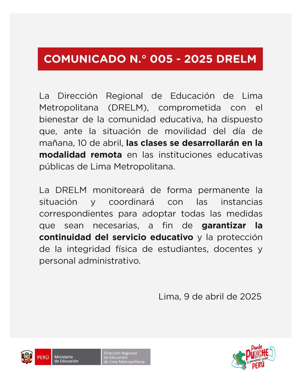 “La Dirección Regional de Educación de Lima Metropolitana (DRELM), comprometida con el bienestar de la comunidad educativa, ha dispuesto que, ante la situación de movilidad del día de mañana, 10 de abril, las clases se desarrollarán en la modalidad remota en las instituciones educativas públicas de Lima Metropolitana”, se detalla en el comunicado.