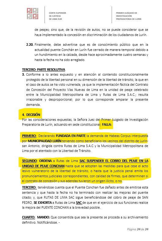 Según la sentencia emitida por la Corte Superior de Justicia de Lima Sur, se determinó que el funcionamiento del peaje vulnera el derecho constitucional al libre tránsito. Por ello, el fallo dispone que la concesionaria Rutas de Lima S.A.C. suspenda el cobro en dicha unidad hasta que cesen los actos lesivos o la justicia penal establezca el origen del contrato de concesión.