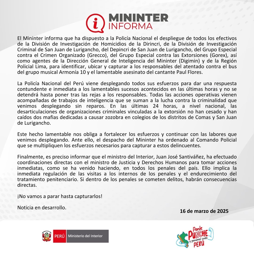 El gremio enfatizó que estos hechos no pueden quedar impunes y exigió al Gobierno, al Ministerio del Interior, al Ministerio Público, al Poder Judicial y a la Policía Nacional que actúen con firmeza para erradicar la violencia y brindar garantías de seguridad a los artistas y empresarios que constantemente son víctimas de amenazas.