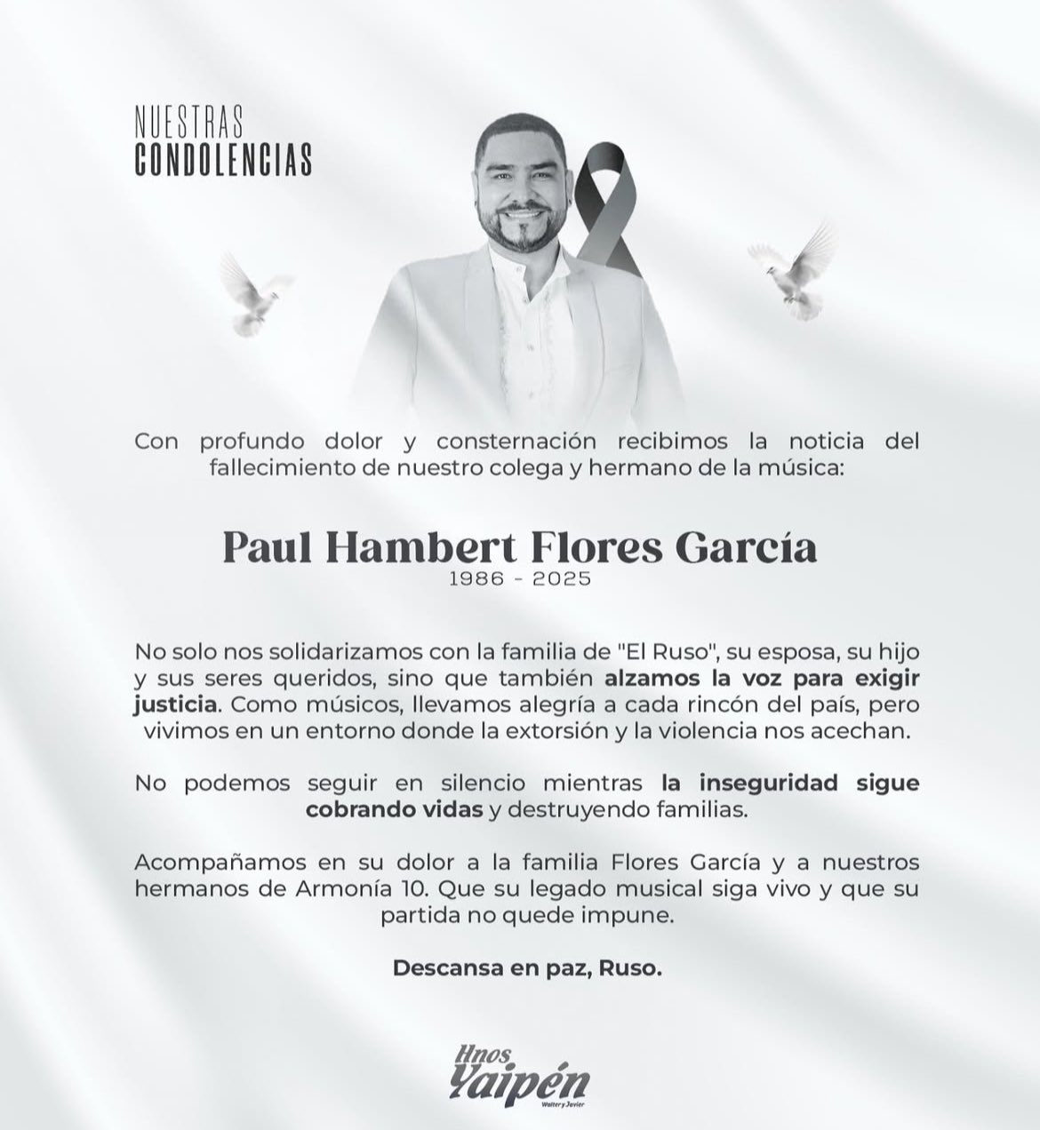 “Quiero mandarle mi más sentido pésame a la familia de Paul Flores, cantante de Armonía 10. Todos ellos gente de primera, ellos sufrieron un ataque en el propio ómnibus, lo cual ha parecido impactante para todos, pero Paul nos dejó”, escribió Romero, visiblemente afectado por la noticia.