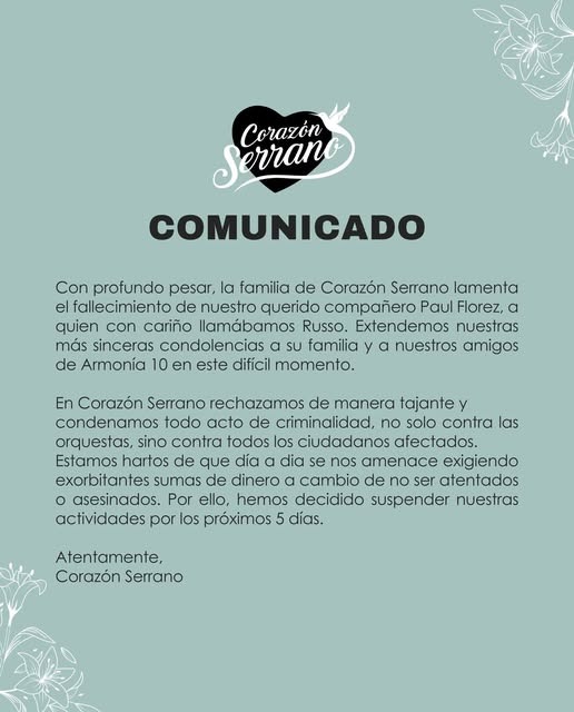 El Sector de Espectáculos Artísticos, Culturales y Afines (ARENA) del Gremio de Servicios de la Cámara de Comercio de Lima expresó su más enérgico rechazo por el asesinato de Paul Flores, primera voz de la orquesta Armonía 10.