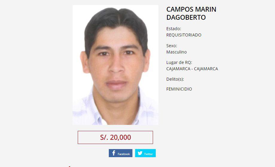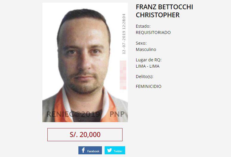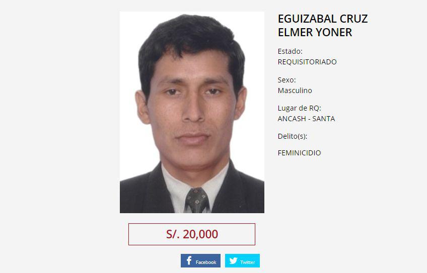 Para facilitar su captura, el Ministerio del Interior (Mininter) lo incluyó en el Programa de Recompensas con un monto de 30 mil soles por información que ayude a ubicarlo. Así como él, otros 18 sujetos con órdenes de captura por feminicidio se encuentran en la lista de los más buscados por la Policía Nacional del Perú.