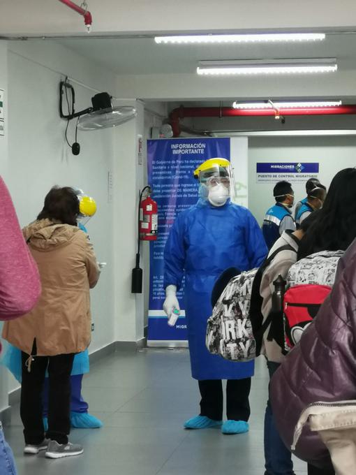 El joven recuerda que en Arequipa tuvieron que esperar varias horas hasta que los policías y militares en el aeropuerto los organizaron en tres grupos de aproximadamente 80 personas. Ahí, el personal de salud les midió la temperatura y les hicieron preguntas sobre los lugares en los que habían estado semanas antes y sobre su estado de salud.