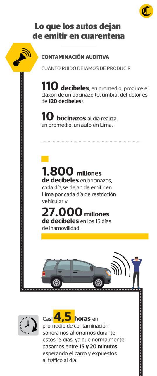 El claxon de un vehículo, en promedio, produce 110 decibeles (el umbral del dolor es de 120 decibeles). Un auto en Lima, en promedio, puede producir 10 bocinazos al día en un recorrido promedio de 20 kilómetros. Cada día de restricción vehicular, Lima está dejando de emitir 1.800 millones de decibeles en bocinazos y 27.000 millones de decibeles en los 15 días de inamovilidad.