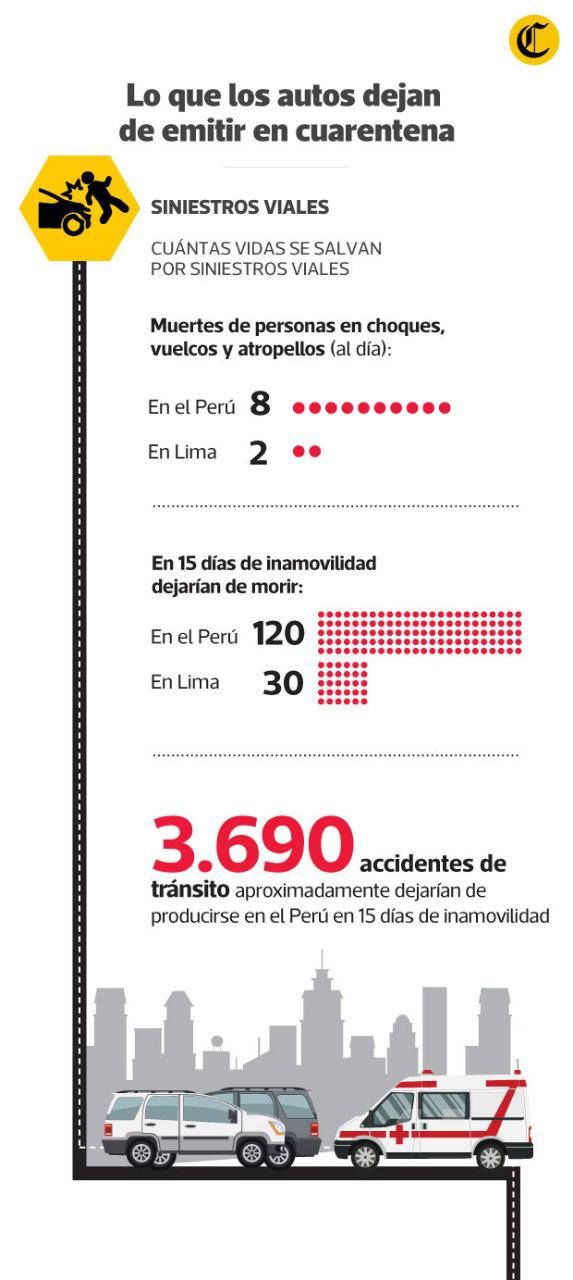 ¿Una pandemia con más beneficios que daños? Si bien no hay una respuesta exacta, el bloqueo del coronavirus podría estar salvando más vidas al prevenir otras desgracias, como los siniestros viales, que al prevenir la propia infección: cada día, en todo el Perú, mueren 8 personas en choques, volcaduras y atropellos. En Lima, dos por día. En 15 días de inamovilidad estarían dejando de morir 120 personas en siniestros viales en el país. En Lima, 30. En 15 días de inamovilidad, en el Perú, dejarían de producirse unos 3.690 accidentes de tránsito aproximadamente.