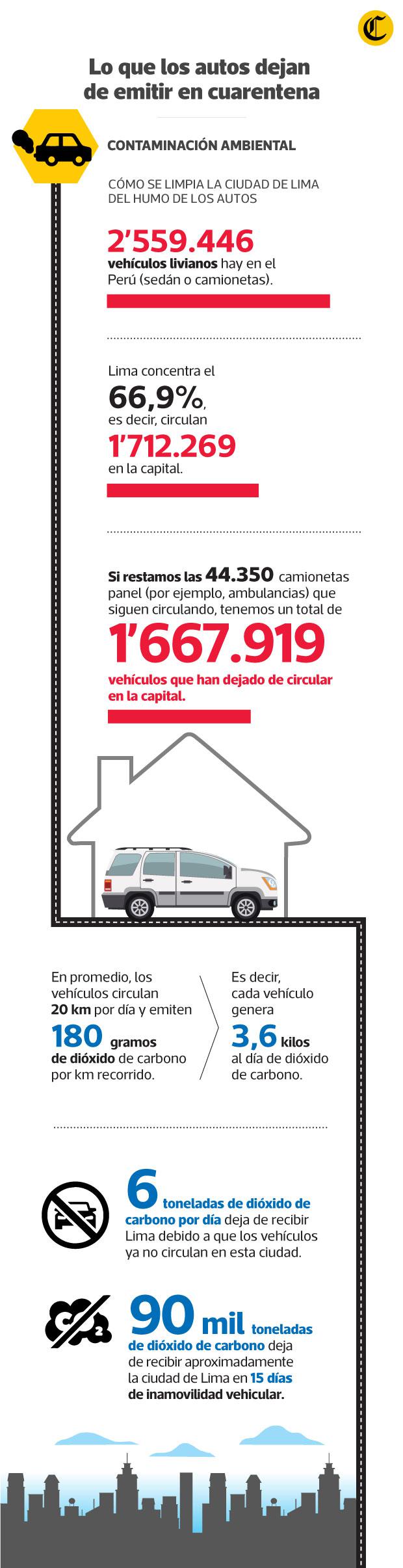 Cada vehículo en Lima generaría unos 3,6 kilogramos al día de dióxido de carbono. Cada 24 horas, al dejar de circular los vehículos particulares en Lima, esta ciudad deja de ‘respirar’ unas seis toneladas de dióxido de carbono. En 15 días de inamovilidad vehicular, en Lima se dejarían de emitir unas 90 mil toneladas de este gas