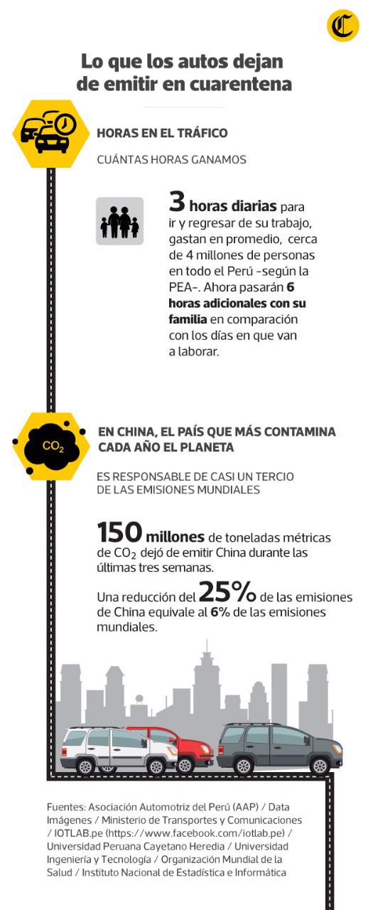 Según un estudio de la calidad del aire realizado entre el lunes 16 y el jueves 19, la Av. Javier Prado ha registrado 30% menos de material particulado tras la restricción casi total de vehículos, en comparación con la semana del lunes 9 al domingo 15 de marzo. Esta medición la hizo la start-up IOTLAB. pe, la cual opera una red de monitoreo de gases contaminantes con seis sensores colocados en la ciudad, en alianza con los municipios de San Isidro y San Borja.