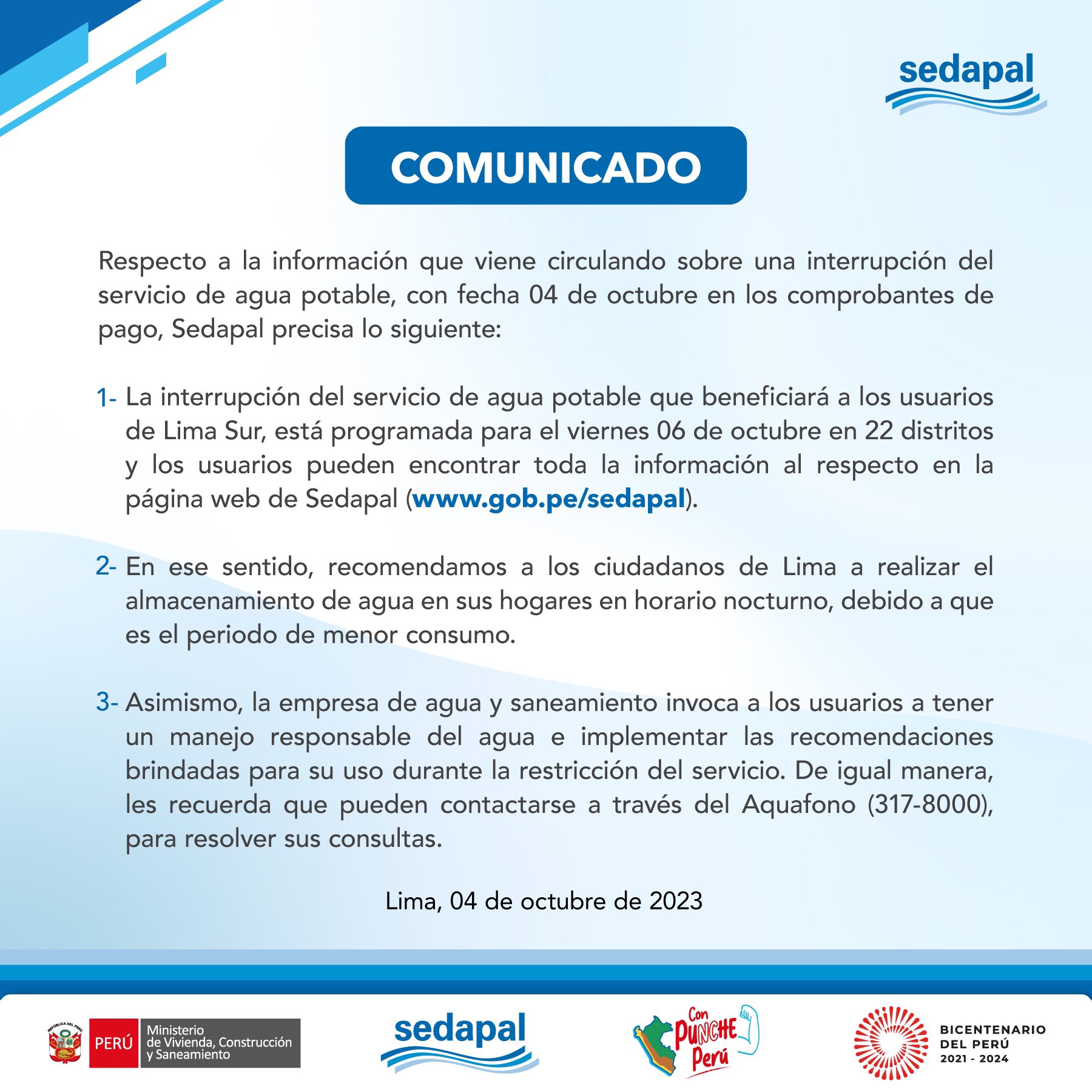 Mediante un comunicado en sus redes sociales, Sedapal indica que las interrupciones del servicio reportadas en distintos puntos de la capital, no están vinculados a la restricción del viernes 06 de octubre.