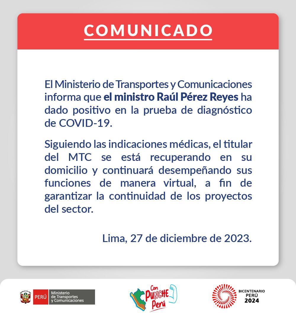 El Ministerio de Transportes y Comunicaciones (MTC), a través de un comunicado en sus redes sociales, informó que el titular de esta cartera, Raúl Pérez-Reyes, dio positivo a COVID-19 este miércoles 27 de diciembre.