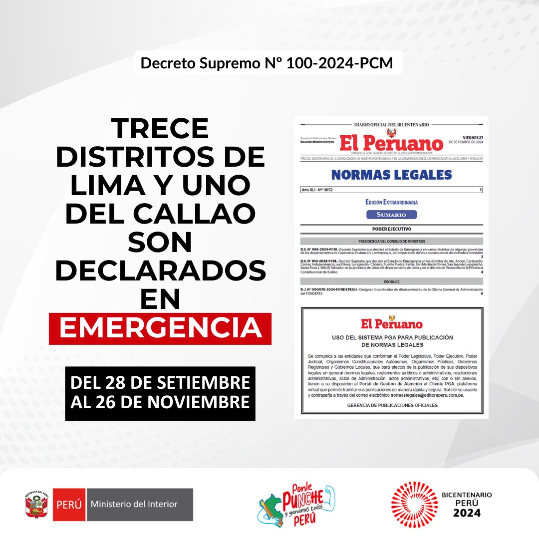 El Poder Ejecutivo oficializó la declaratoria de estado de emergencia en 14 distritos de Lima y Callao: Ate, Ancón, Carabayllo, Comas, Independencia, Los Olivos, Lurigancho - Chosica, Puente Piedra, Rímac, San Martín de Porres, San Juan de Lurigancho, Santa Rosa, Villa El Salvador y en Ventanilla (Callao).
