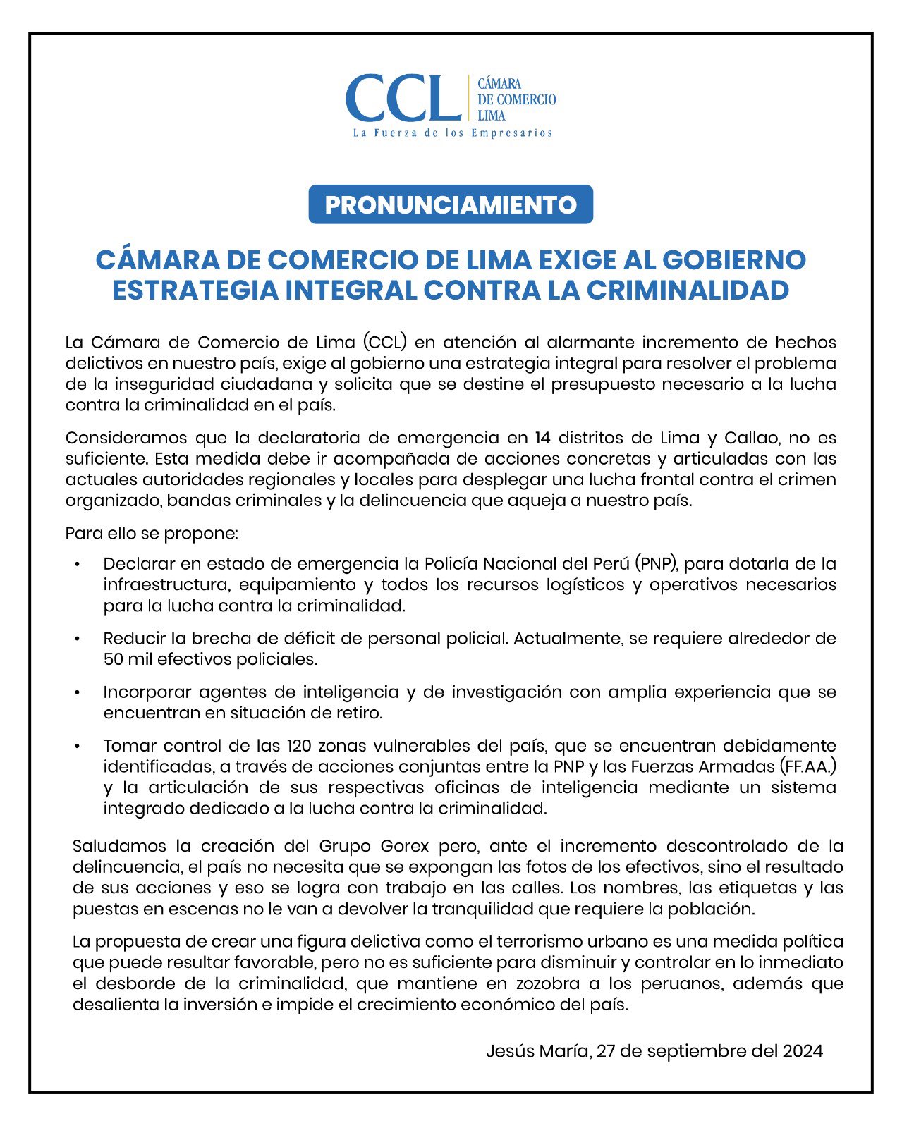 Comunicado del gremio empresarial