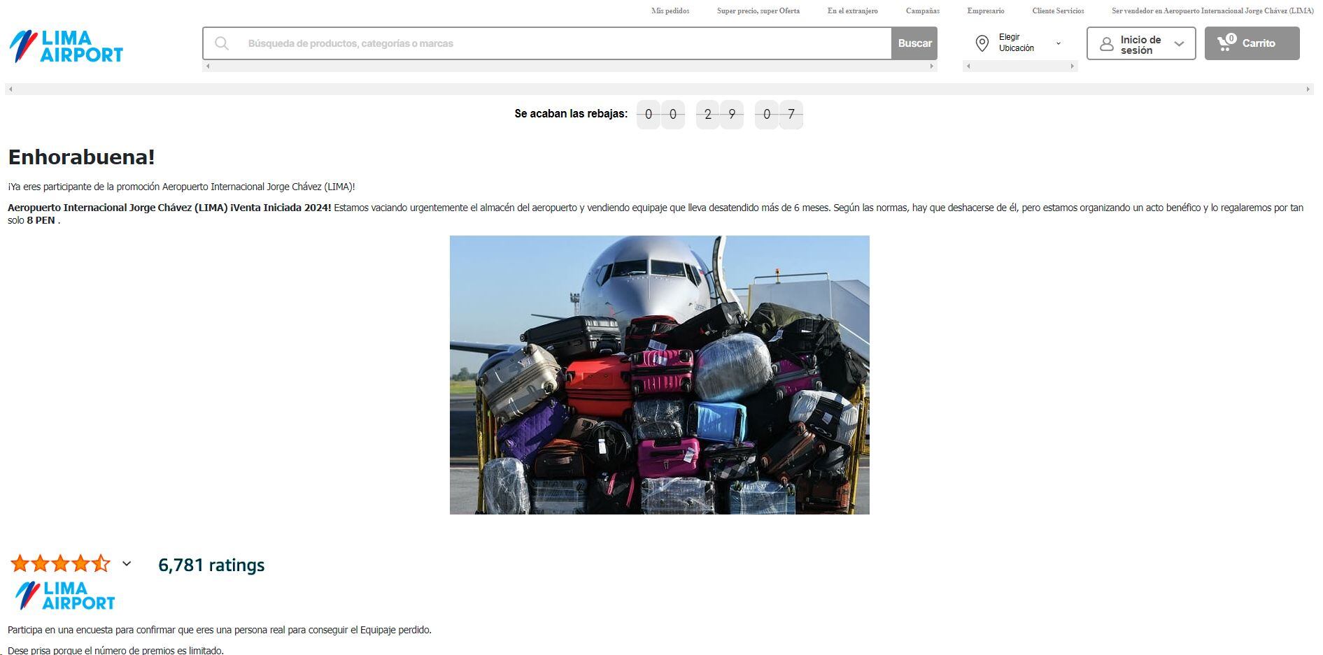 Asimismo, debajo hay un par de líneas de bienvenida: “Enhorabuena! Aeropuerto Internacional Jorge Chávez (LIMA) ¡Venta Iniciada 2024! Estamos vaciando urgentemente el almacén del aeropuerto y vendiendo equipaje que lleva desatendido más de 6 meses. Según las normas, hay que deshacerse de él, pero estamos organizando un acto benéfico y lo regalaremos por tan solo 8 PEN”.