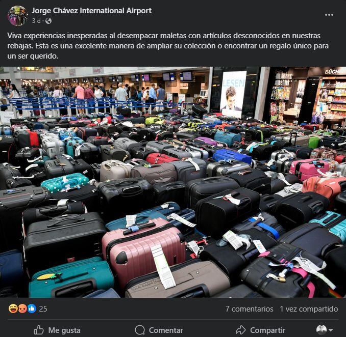 Ante esta modalidad de estafa, en la que supuestamente se anuncia una venta de equipajes olvidados en el Aeropuerto Internacional Jorge Chávez, mediante sus redes sociales LAP precisó que se trata de información falsa y exhortó al público a no dejarse engañar por estas publicaciones.