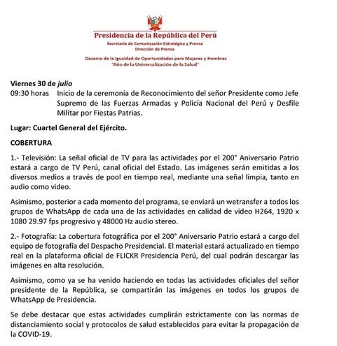 La agenda indica también que, antes del desfile militar, se llevaría a cabo la ceremonia de reconocimiento al presidente como jefe supremo de las Fuerzas Armadas y la Policía Nacional del Perú. Uno de los actos protocolares de este evento es la entrega del bastón de mando, que simboliza el mando superior, y la placa con las insignias de las instituciones.