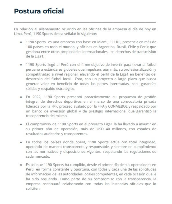 El policía informó que no encontraron a ningún representante de 1190 Sports en su oficina de Lima. Horas después del operativo, la empresa 1190 Sports afirmó, en un comunicado, que actúa “con total integridad, operando de manera transparente y responsable, y siempre en cumplimiento con las normativas y disposiciones vigentes”.
