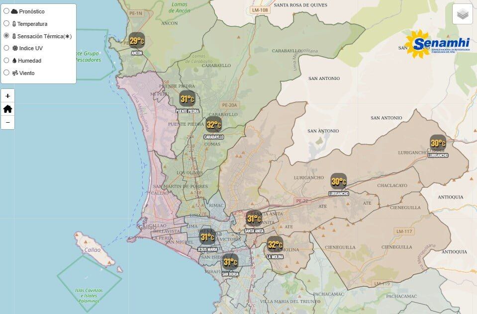 El Servicio Nacional de Meteorología e Hidrología del Perú (Senamhi) informó, a través de sus canales oficiales, que los distrito de La Molina y Carabayllo registran una sensación térmica que llega hasta los 32 °C.