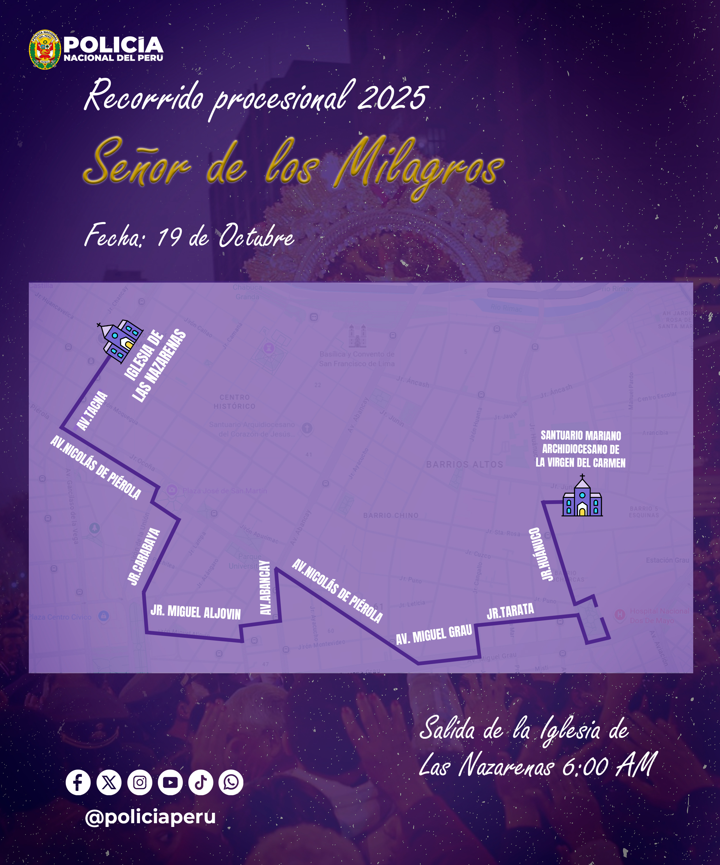 El recorrido procesional del Señor de Los Milagros se encuentra en la cuadra 1 del jirón de Miguel Aljovín.