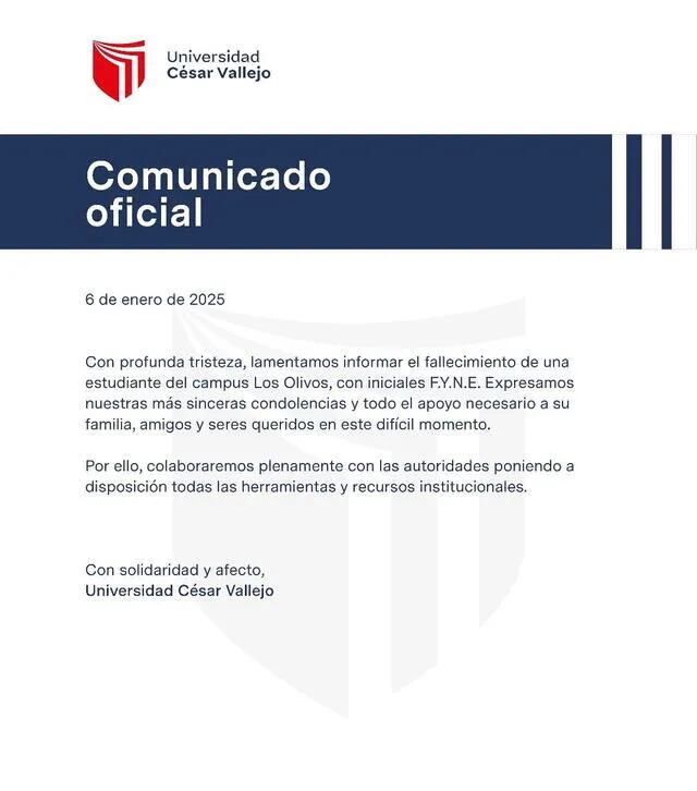 “Lamentamos informar el fallecimiento de una estudiante del campus Los Olivos, con iniciales F.Y.N.E. Expresamos nuestras más sinceras condolencias y todo el apoyo necesario a su familia, amigos y seres queridos en este difícil momento”, se lee en su pronunciamiento.