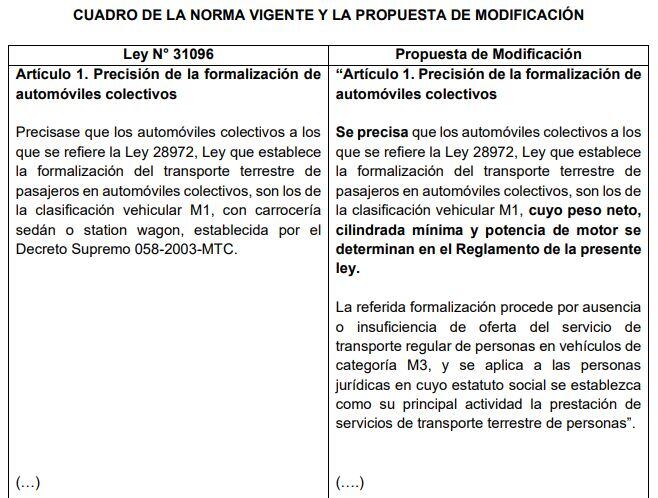 Además, se busca modificar el artículo 1 de la Ley N° 31096, la cual precisa que los automóviles colectivos autorizados en el ámbito nacional son los de clasificación vehicular M1, con carrocería sedán o station wagon. Con la modificatoria, este apartado pasaría a señalar que los vehículos colectivos M1 autorizados son aquellos cuyo peso neto, cilindrada mínima y potencia de motor se determinan en el Reglamento de la presente ley.