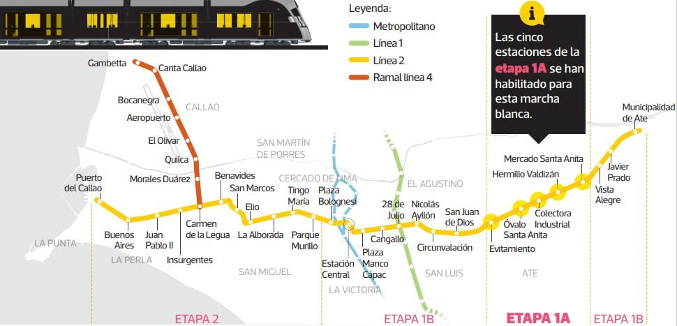 Esta primera etapa de marcha blanca (Etapa 1A) comprende cinco estaciones ubicadas a lo largo de cinco kilómetros: Mercado Santa Anita, Hermilio Valdizán, Colectora Industrial, Óvalo Santa Anita y Evitamiento. Una vez en funcionamiento, los usuarios podrán trasladarse desde la primera hasta la quinta estación en tan solo 6 minutos, reduciendo significativamente el tiempo que demorarían en transporte público.
