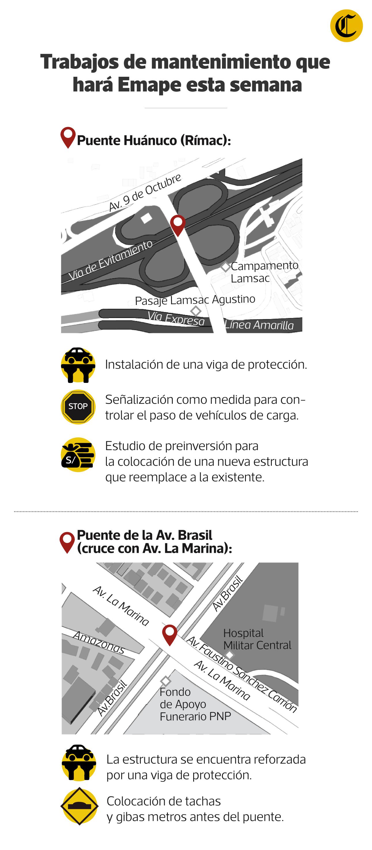 Los puentes que serán intervenidos en los siguientes días son los puentes: Castilla, Huánuco y de la Av. Brasil. En el primer puente, se colocará una viga de protección, la cual evitará daños en la infraestructura ante posibles colisiones y asimismo vienen realizando una evaluación de daños, a fin de determinar una solución técnica a largo plazo.