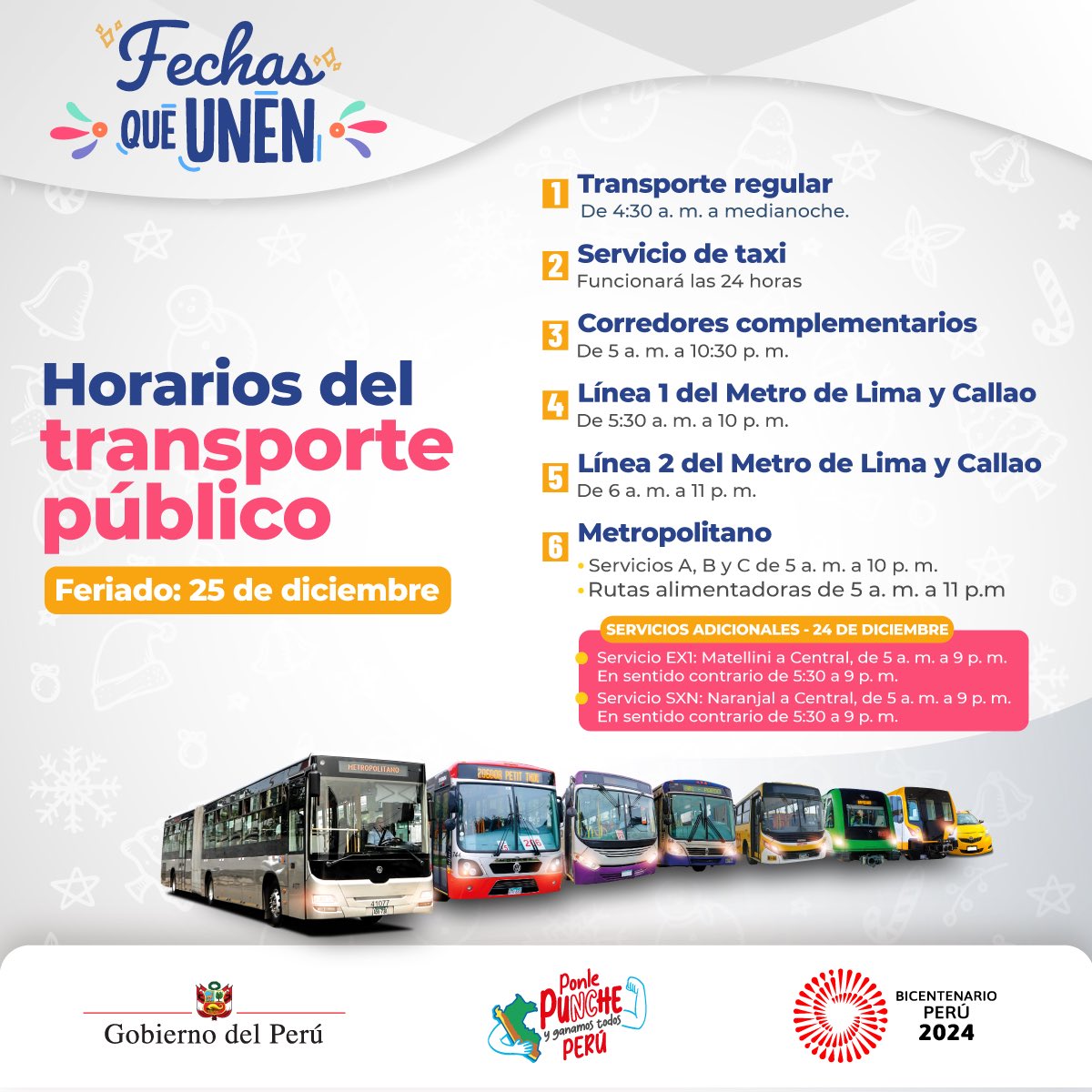 A través de sus redes sociales, la ATU indicó que, este miércoles 25, los servicios regulares A, B y C circularán desde las 5 a.m. hasta las 10 p.m. y las rutas alimentadoras hasta las 11 p.m.