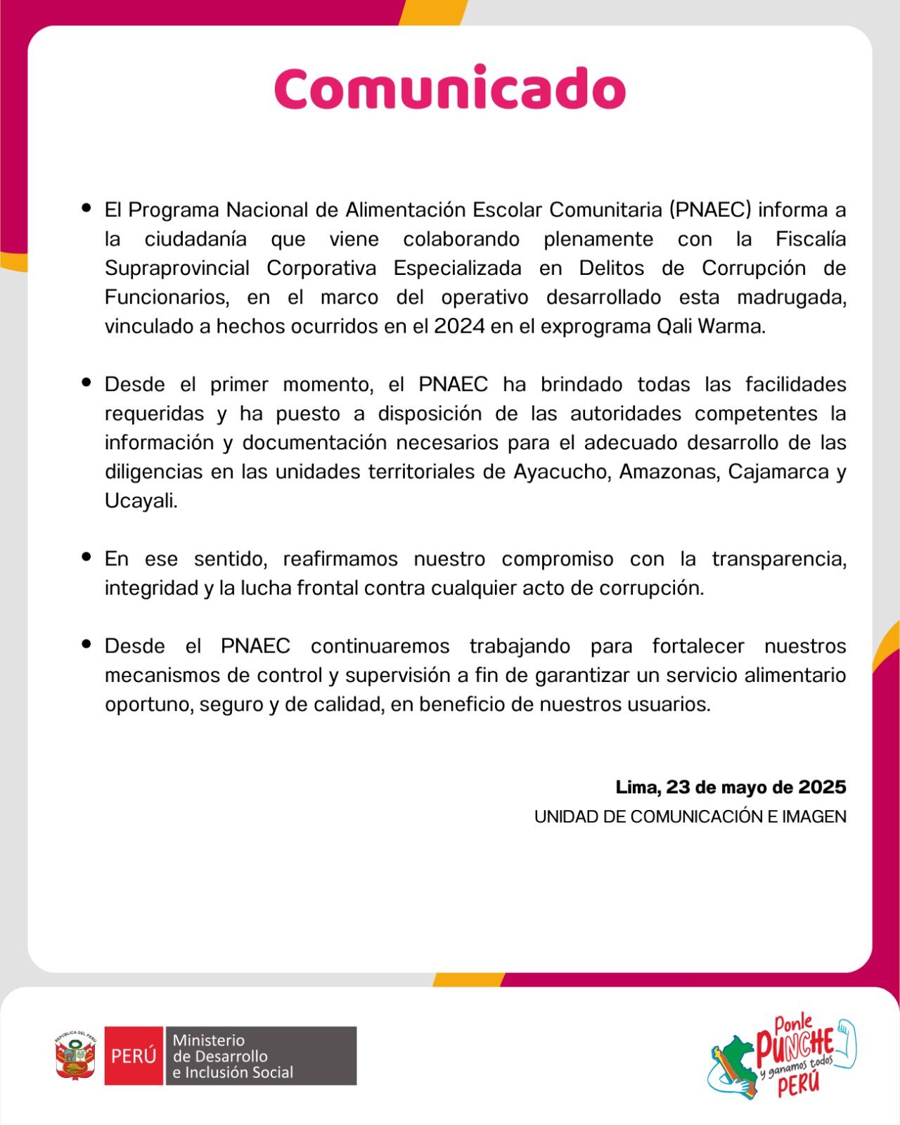 Durante un megaoperatico realizado en cuatro regiones del Perú, la Fiscalía Supraprovincial Corporativa Especializada en Delitos de Corrupción de Funcionarios (Noveno Despacho) intervino 11 inmuebles y detuvo a cuatro funcionarios de las unidades territoriales del extinto Programa Nacional de Alimentación Escolar Comunitaria Wasi Mikuna (ex Qali Warma) en Ayacucho (Humanga y Huanta), Amazonas (Chachapoyas), Cajamarca y Ucayali (Pucallpa).