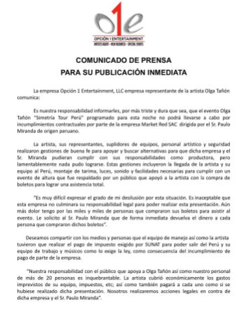 “El evento Olga Tañón ‘Simetría Tour Perú’, no podrá llevarse a cabo por incumplimientos legales específicamente con los pagos de las entidades Apdayc y Sunat de parte de la empresa Market Red SAC, dirigida por el Sr. Pablo Miranda de origen peruano. Además de incumplimientos de pagos a la artista, proveedores en Perú y empresas de montaje”, manifestó Opción 1 Entertainment, LLC.
