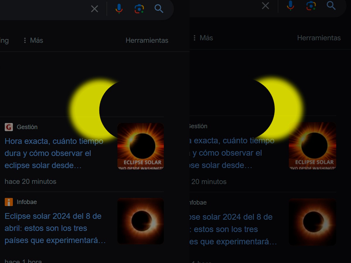 Una de las cosas que muchos vivirán en Estados Unidos, Canadá y México es el nuevo eclipse solar, evento astronómico que se realizará este 8 de abril y con el que podrás ver cómo la Luna cubre lentamente al Sol. Con la finalidad de que no te pierdas nada sobre este fenómeno que se visualizará sin telescopio en diversas ciudades, hoy te traigo un “easter egg” que funciona perfectamente en Google. ¿Has tratado de buscar algo relacionado a dicha fecha? Pues esto te parecerá interesante. Cabe precisar que en el buscador de la compañía de Mountain View no solo podrás encontrar este tipo de curiosidades, sino también juegos.