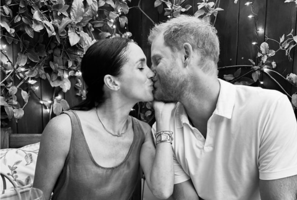En la foto en blanco y negro, Meghan y Harry aparecen dándose un beso mientras disfrutan de una comida juntos.