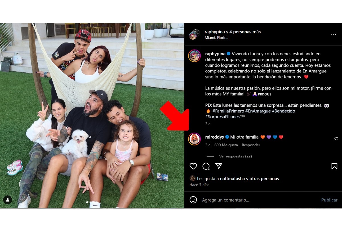 Según People, todo comenzó con un post de Raphy Pina el fin de semana, donde se le ve disfrutando de un día en familia junto a Natti Natasha y compañía. Hasta ahí, nada fuera de lo común, pero lo que llamó la atención fue el césped artificial en la foto, que muchos notaron era sospechosamente parecido al que aparecía en unas imágenes que Mireddys compartió en sus historias de Instagram y que, curiosamente, ya no están disponibles. “Mi otra familia”, exclamó cariñosa Mireddys al reaccionar a la foto.