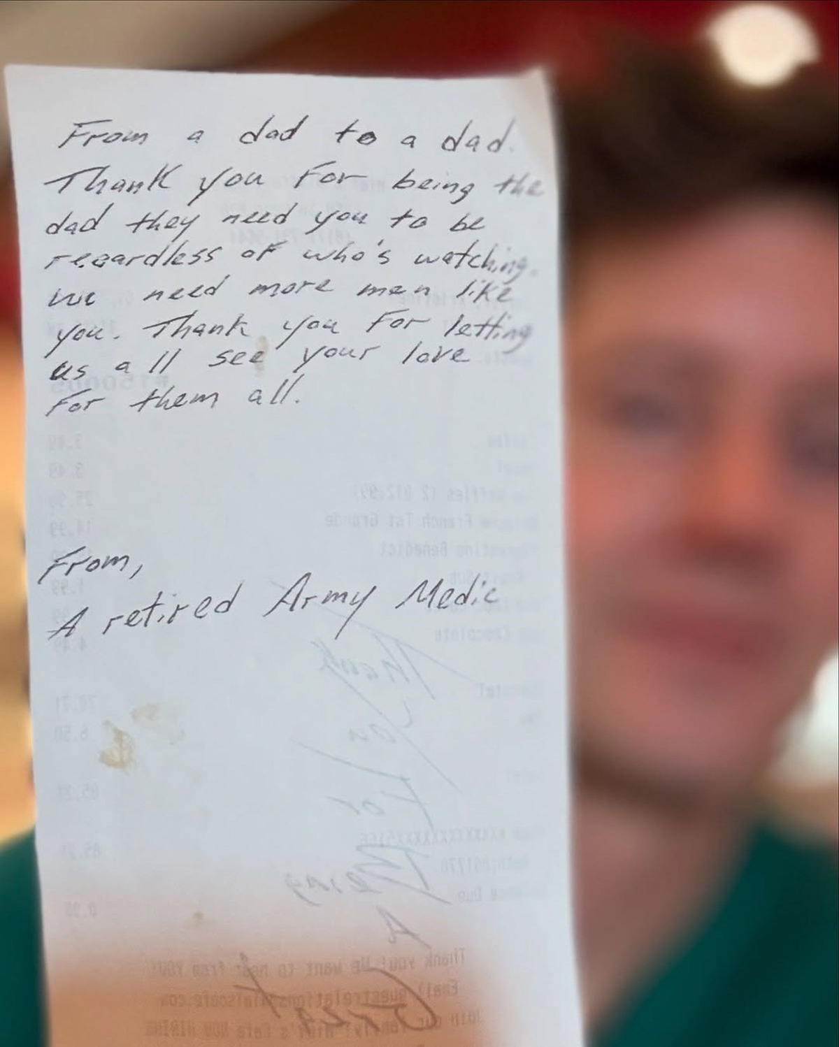 En la cara de la boleta, el desconocido le puso: “Gracias por ser un gran padre”. Sin embargo, eso no es todo, ya que al dar la vuelta al recibo, Slaughter encontró otro texto escrito a mano por el extraño: “De un padre a un padre. Gracias por ser el padre que necesitan que seas sin importar quién esté mirando. Necesitamos más hombres como tú. Gracias por dejarnos ver a todos tu amor por todos ellos”.