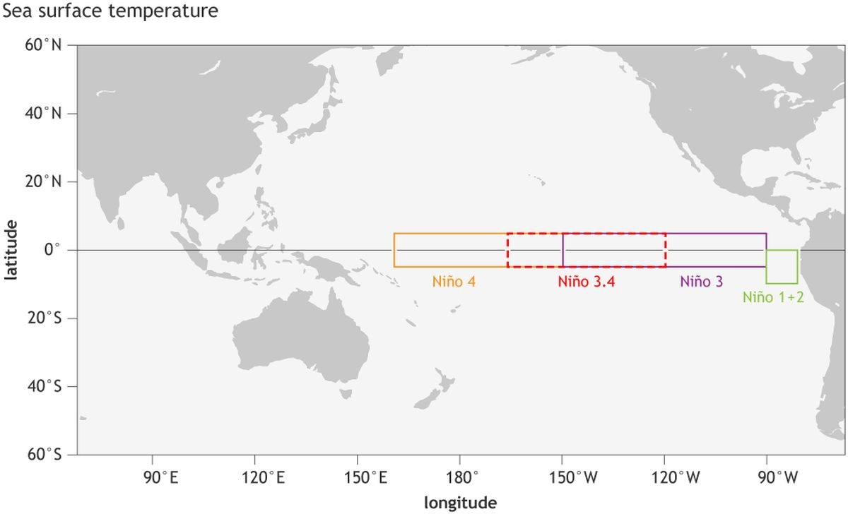 La NOAA considera que las condiciones de El Niño están presentes cuando el Índice Oceánico Niño (ONI, en inglés) registra, en el área conocida como la región Niño-3.4 (ubicada en el Pacífico), un aumento de 0,5 °Celsius (0,9 ˚Fahrenheit) en la temperatura de la superficie del océano Pacífico tropical por encima del promedio.