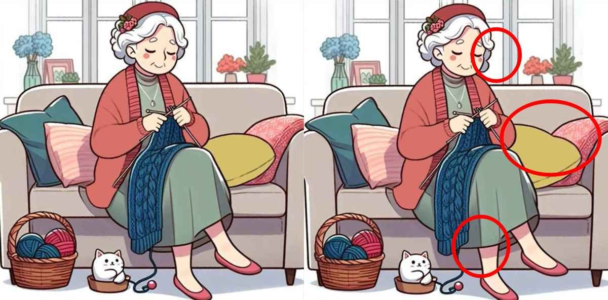 La foto que se comparte muestra a una abuela sentada cómodamente en un sofá y dedicada a su trabajo de tejer un suéter. Estas dos imágenes tienen tres diferencias y solo hay 15 segundos para distinguirlas. Aunque algunas de estas discrepancias serán obvias, otras requerirán un examen exhaustivo. Como resultado, es necesario concentrarse para encontrar todas las diferencias entre las dos ilustraciones. ¡El tiempo está pasando muy rápido!