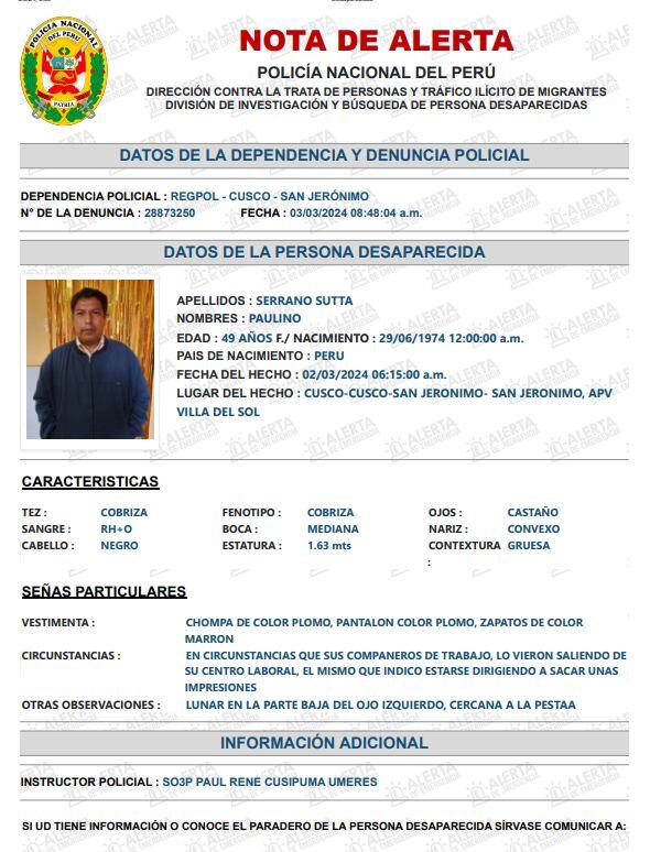 El Área de Investigación de Personas Desaparecidas pertenecientes al Departamento de Investigación Criminal Cusco y la comisaría de San Jerónimo, formularon la nota de alerta por la desaparición de Paulino Serrano. El documento fue difundido por diferentes comisarías, unidades policiales del ámbito de la Región Cusco y a nivel nacional, asimismo por medios de comunicación local y redes sociales, que finalmente culminó con la ubicación del ex regidor por los trámites administrativos que hizo en una agencia de Ica.