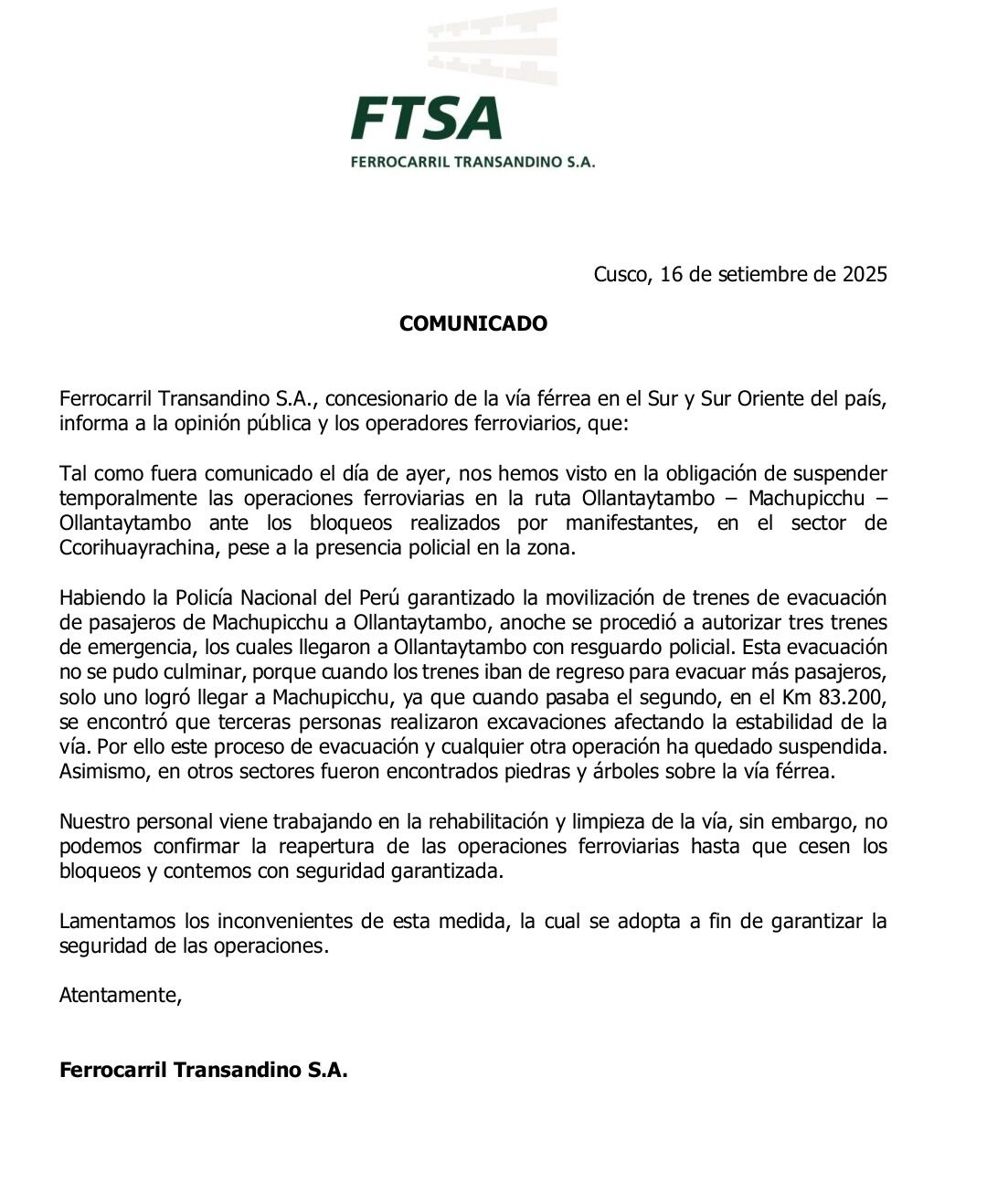 Ferrocarril Transandino S.A., concesionario de la vía férrea en el sur y sur oriente del país, anunció la suspensión de todas las operaciones ferroviarias en la ruta Ollantaytambo – Machu Picchu – Ollantaytambo debido a los bloqueos registrados en el sector de Ccorihuayrachina.