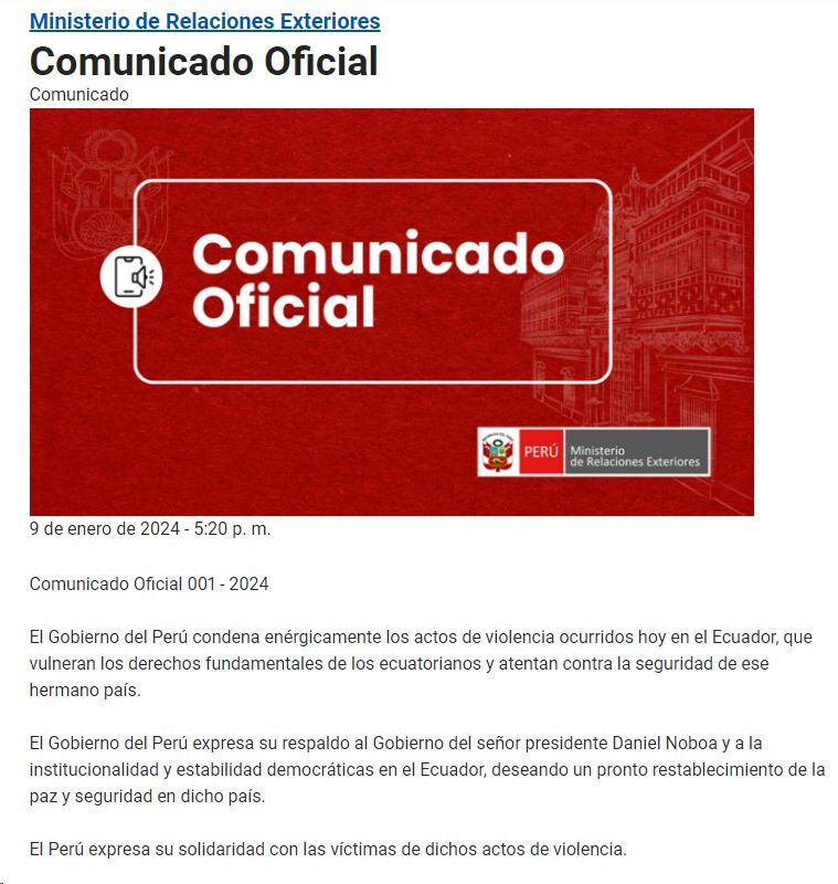 “El Gobierno del Perú condena enérgicamente los actos de violencia ocurridos en el Ecuador, que vulneran los derechos fundamentales de los ecuatorianos y atentan contra la seguridad de ese hermano país. El Gobierno del Perú expresa su respaldo al Gobierno del señor presidente Daniel Noboa y a la institucionalidad y estabilidad democráticas en el Ecuador. El Perú expresa su solidaridad con las víctimas de dichos actos de violencia”, señala el escrito.