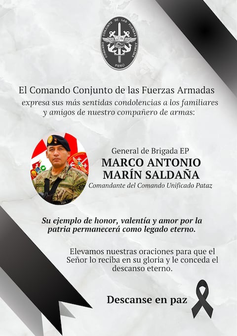 “Con profundo pesar, expresamos nuestras más sentidas condolencias a la familia del general de brigada del Ejército del Perú, Marco Marín Saldaña”, indicó el mensaje oficial. La Presidencia añadió que el Gobierno “ha dispuesto una exhaustiva investigación para esclarecer las circunstancias en que ocurrió el accidente”.
