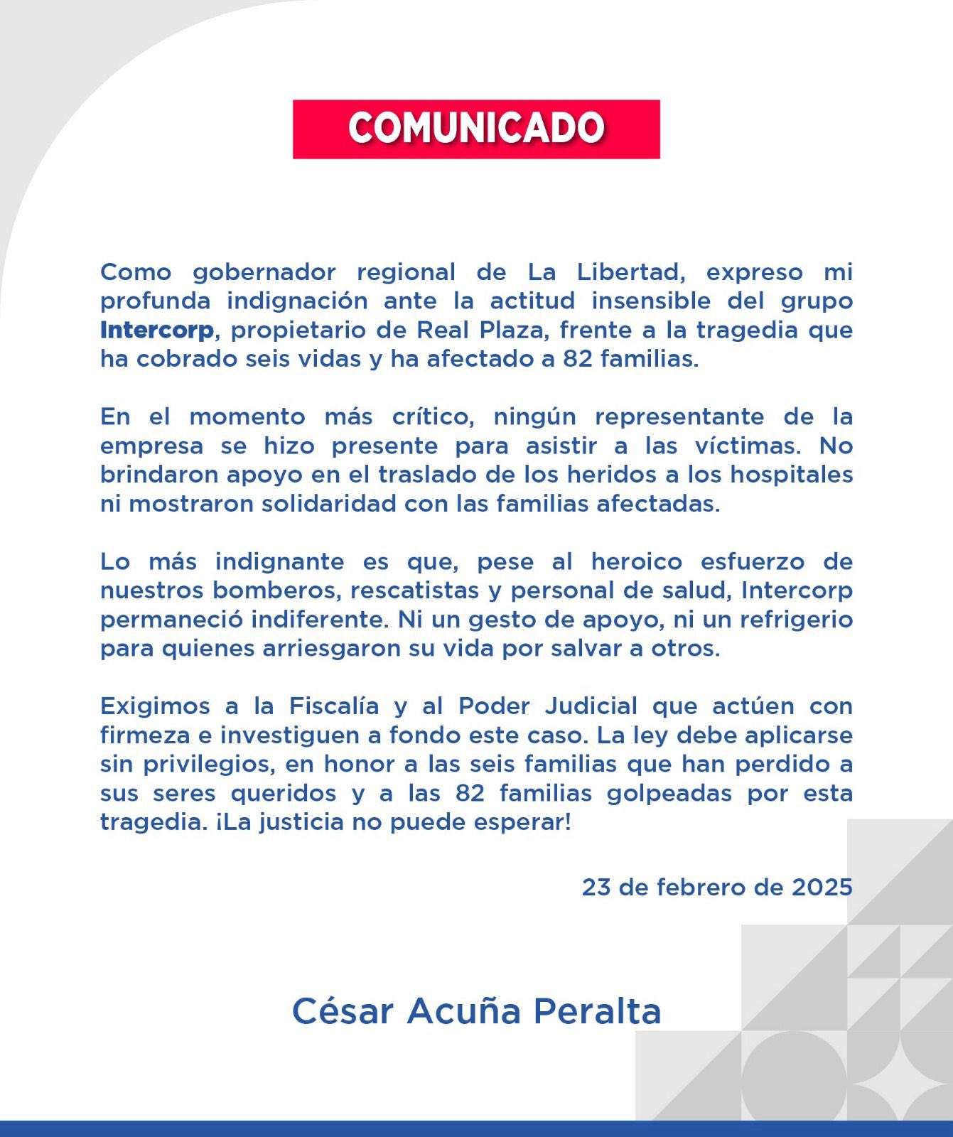 El gobernador regional de La Libertad, César Acuña, lamentó el suceso ocurrido en el centro comercial Real Plaza de Trujillo en la noche del viernes 21 de febrero. A través de un mensaje en su cuenta de 'X', indicó que se despliegan equipos de rescate para ayudar a las personas que se encuentran atrapadas entre los escombros y brindar atención a los heridos.