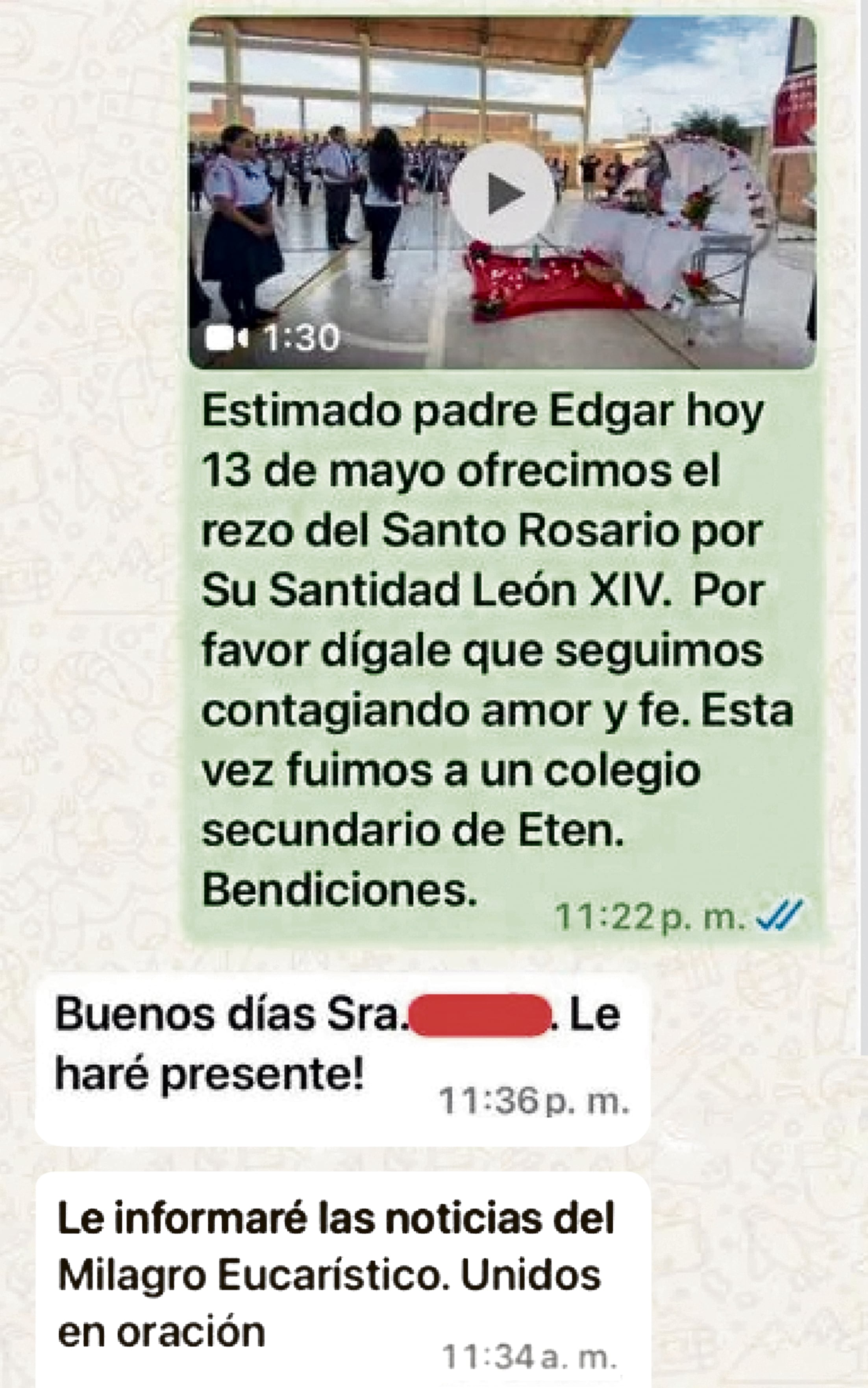 La misma fuente asegura que, a través del padre Rimaycuna, el Papa se mantiene al tanto de los mensajes y muestras de cariño que le llegan por WhatsApp de parte de sus antiguos feligreses. Uno de los mensajes que más ha conmovido al Papa, según esta fuente, ha sido el reconocimiento constante al milagro eucarístico de Eten, una manifestación de fe muy arraigada en esa zona de Lambayeque.