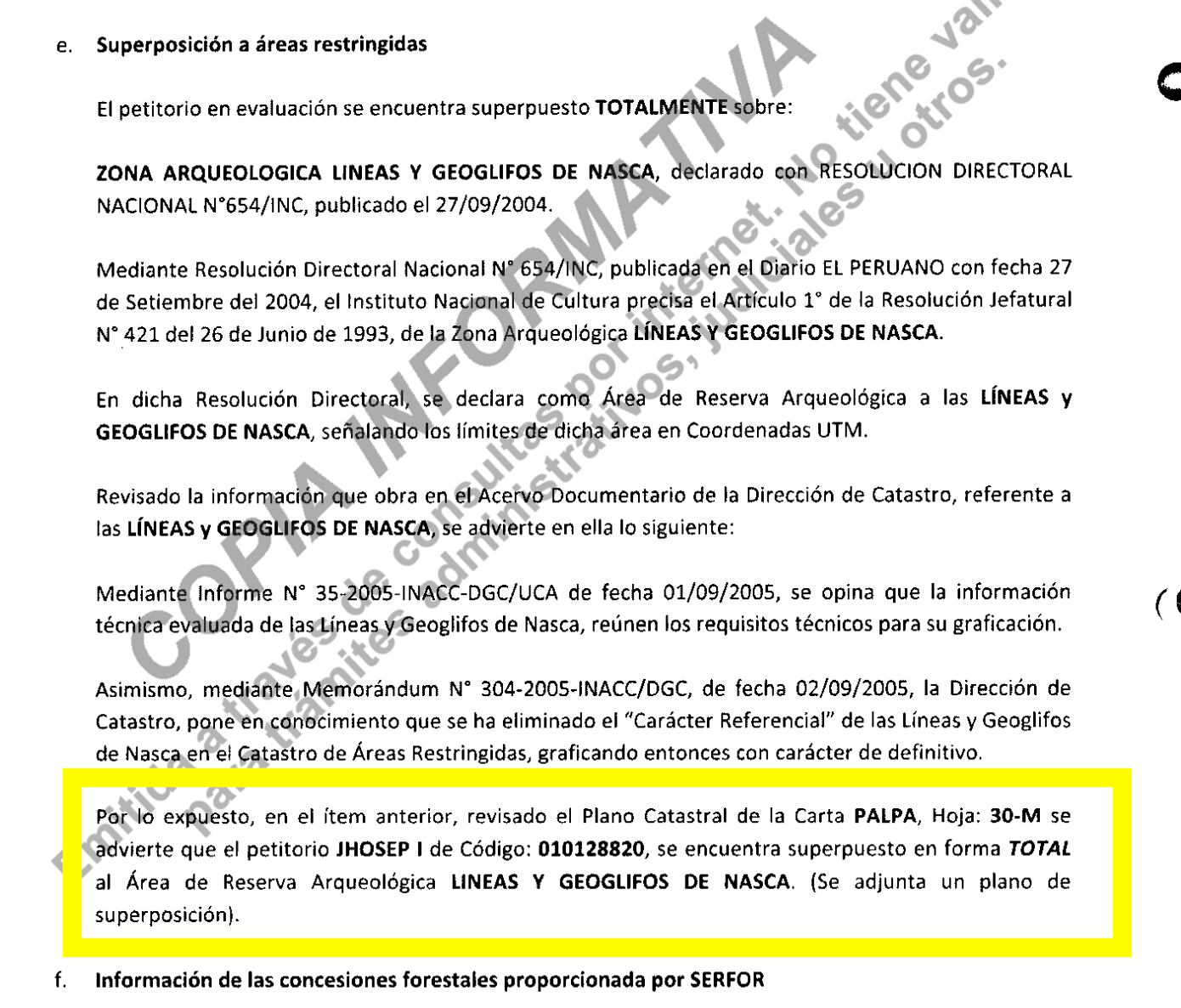“En reiteradas resoluciones, el Consejo de Minería, máxima autoridad minera en sede administrativa, ha confirmado la cancelación de los petitorios mineros superpuestos totalmente al área de reserva arqueológica “Líneas y Geoglifos de Nasca”, señalando que el criterio de respetar al intangibilidad de dicha área se sustenta en las normas que regulan la Protección del Patrimonio Cultural de la Nación”, justifican los documentos a los que este Diario tuvo acceso.