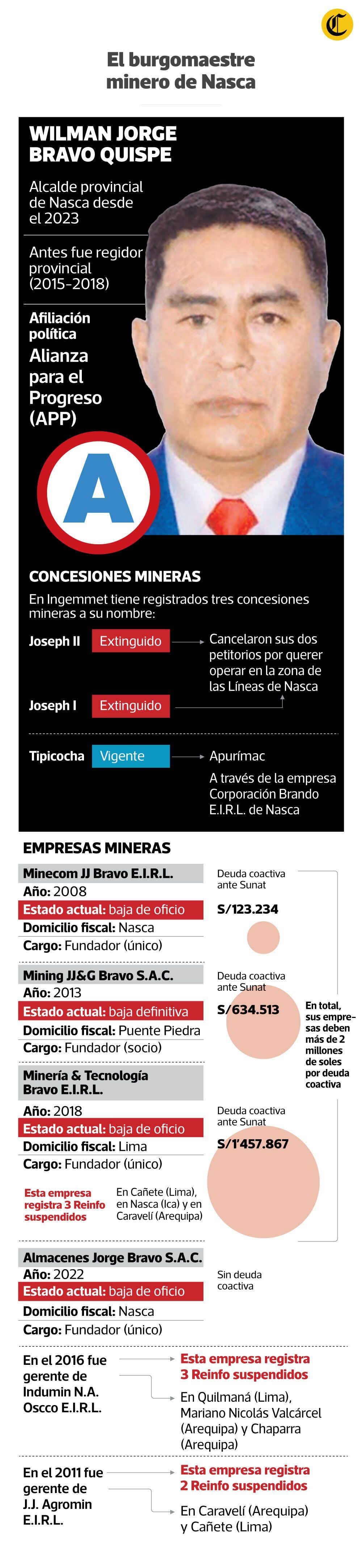 El alcalde provincial de Nasca, Jorge Bravo, uno de los promotores del recorte de la reserva Arqueológica de las Líneas y Geoglifos de Nasca y Palpa, reconoció que tiene más de 25 años en el sector minero, con concesiones en Arequipa, Ayacucho y Apurímac. Lo que no dijo es que también intentó operar dentro del polígono intangible que hoy pide redimensionar.