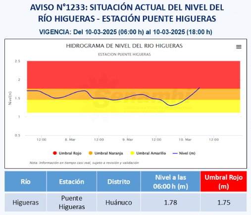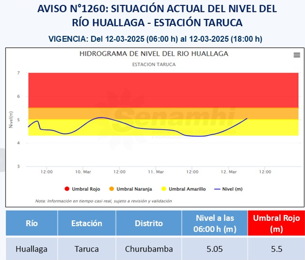 El río Huallaga alcanzó un nivel de 5.05 m esta mañana en la estación hidrológica Taruca, en Huánuco, situándose en el umbral naranja, según reportó el INDECI. Las localidades en riesgo incluyen Taruca, Chunapampa, Taulligan, Shuruyoij, Colpa Baja, Huánuco, Huayllapampa, Mayorgo, Santa María del Valle, Chauragra, Pacapucro y Goyma. Ante el incremento del caudal, las autoridades instaron a la población a evitar cruzar puentes donde el agua se acerca peligrosamente al borde, con el fin de prevenir accidentes y posibles desbordes.