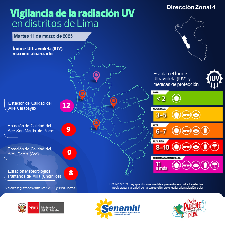De acuerdo con el Senamhi, Lima alcanzó este lunes 10 de marzo el Índice Ultravioleta (IUV) "Extremadamente Alta". Las estaciones Carabayllo y Pantanos de Villa registraron un valor máximo del IUV de 11.