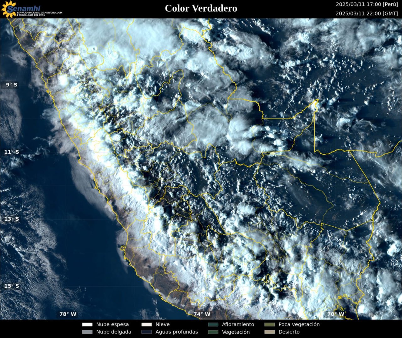 El SENAMHI informó que desde el martes 11 al jueves 13 de marzo se registrarán precipitaciones de moderada a fuerte intensidad en la sierra, incluyendo nieve, granizo, aguanieve y lluvia. Se espera la caída de granizo en zonas sobre los 2800 m s. n. m. y nieve por encima de los 4000 m s. n. m., acompañadas de descargas eléctricas y ráfagas de viento de hasta 35 km/h. Además, el martes se prevén acumulados de 15 mm/día en la sierra centro y 18 mm/día en la sierra sur. No se descartan lluvias ligeras en la costa.