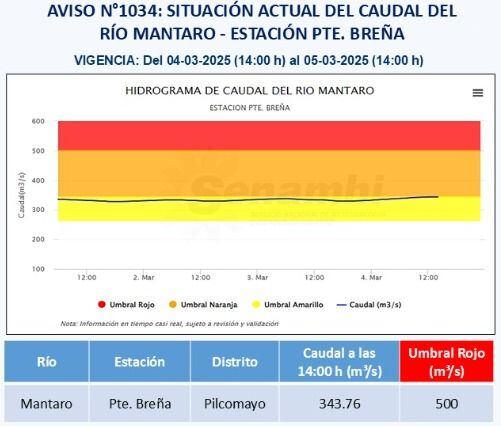 INDECI informa que se reportó aumento del caudal del río Mantaro (Junín) alcanzando 343.76 m3/s y umbral hidrológico naranja.